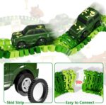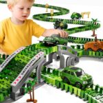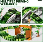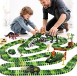 Car Race Track Sets- This flexible track playset included 144 track pieces, 2 electric cars, 4 dinosaur cars, 2 dinosaur models and scene props accessories. Kids can create numerous track layouts, from twists and turns to exciting bridge sections, the possibilities are endless, fostering creativity and problem-solving skills, immerse themselves in thrilling adventures. Perfect dinosaur toys for kids 3-5 years old.