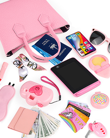 Realistic Toddler Girl Pretend Play Toy —- every item is in realistic design and bright colors. The watch screen will light up and you can adjust the time and date. The phone and key have soft buttons. The fake makeup toys can be opened and pretended to be used on the face. Toy money and cards can be put into the wallet. Little girls can pretend to go out shopping, travel, or dress up and role-play at home. They will never cry for mom’s makeup and purse again. Perfect kids toys for girls!