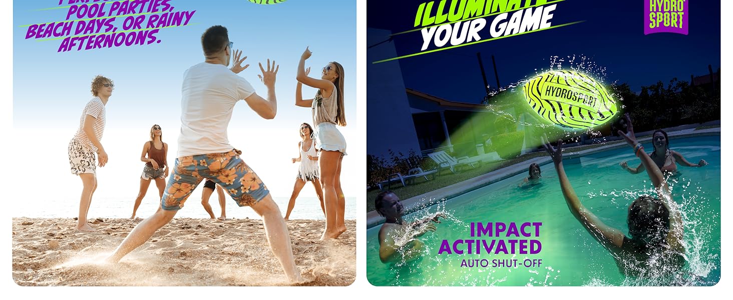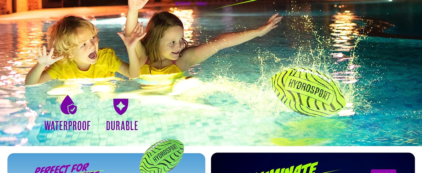 LIGHTS UP ON IMPACT: The Hydrosport Light-up Water Football flashes to life every time it’s thrown or caught, thanks to built-in impact-activated LEDs. Whether you’re diving for a catch or tossing it across the pool after sunset, the light-up effect takes every game to the next level. Batteries come preinstalled.