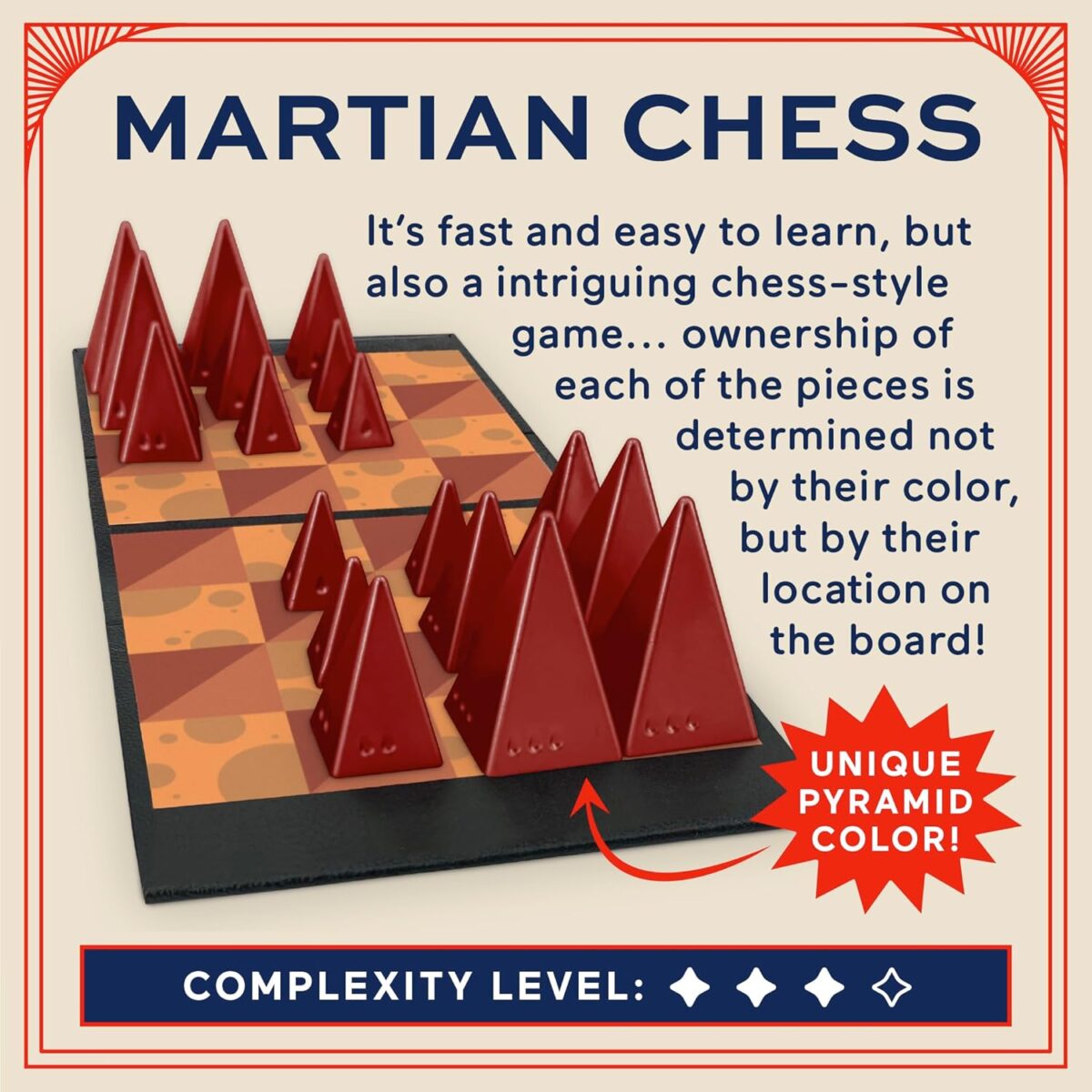 Beautiful Design – This game looks nice simply sitting on a coffee table in your house. It gives a room a modern, homey feeling. Martian Chess also makes the best gift for boys, girls and adults who love strategy games, space, Mars, Sci-Fi and Chess