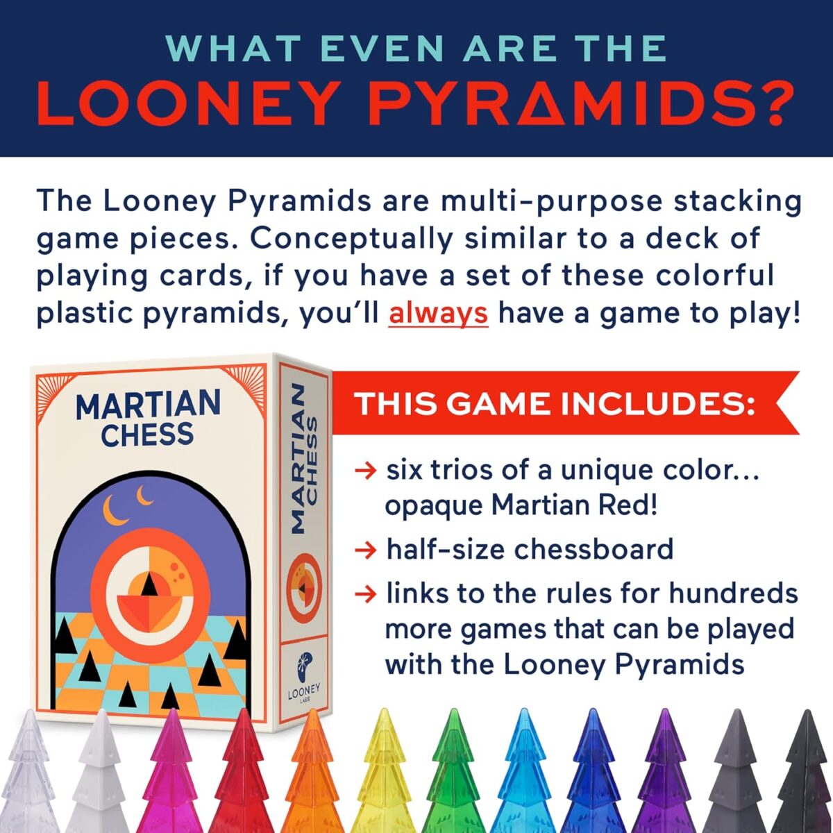 Each box includes clear, easy-to-follow instructions for playing, 18 opaque “Martian red” pyramids which make 6 Trios each and 1 foldable game board. These make great tabletop games that can be played at home or on the go whether it be for a road trip or travel.