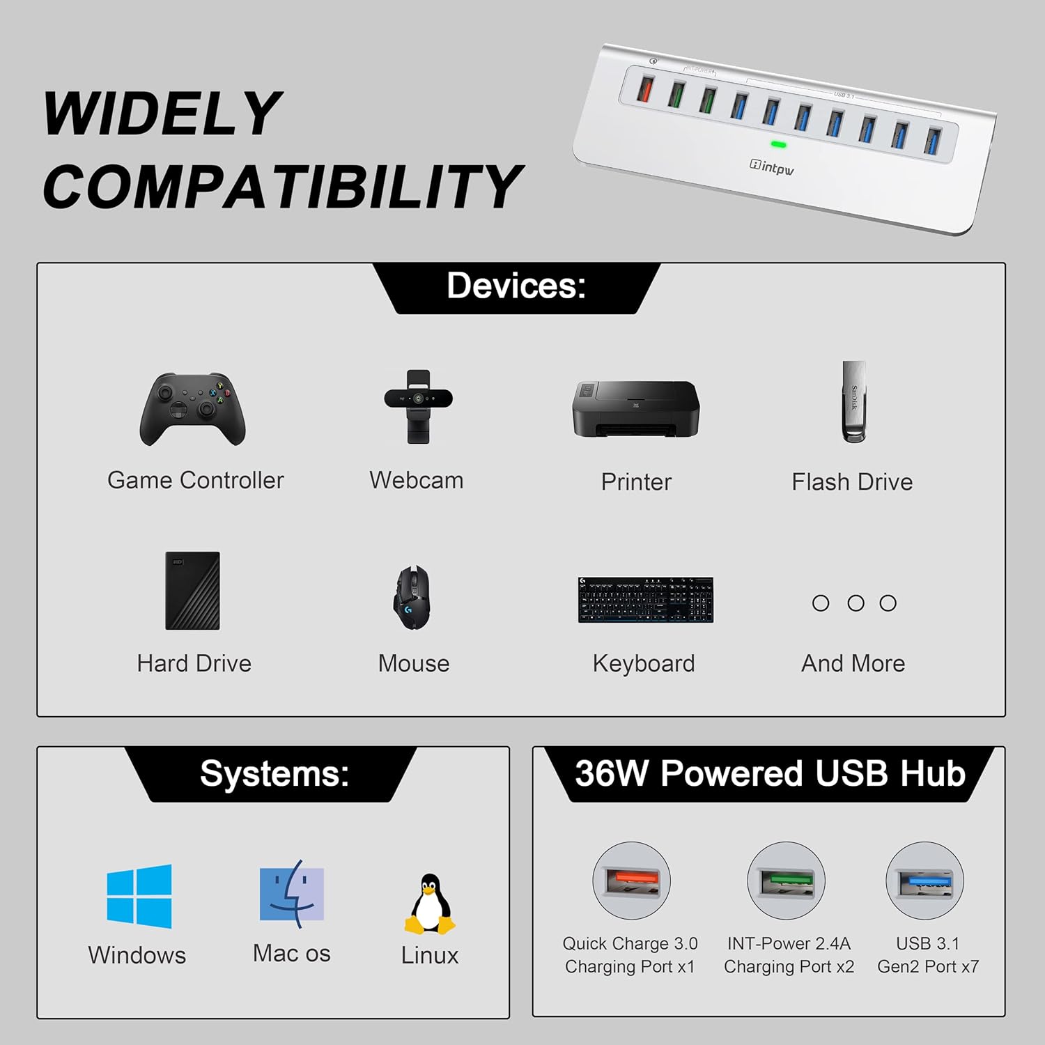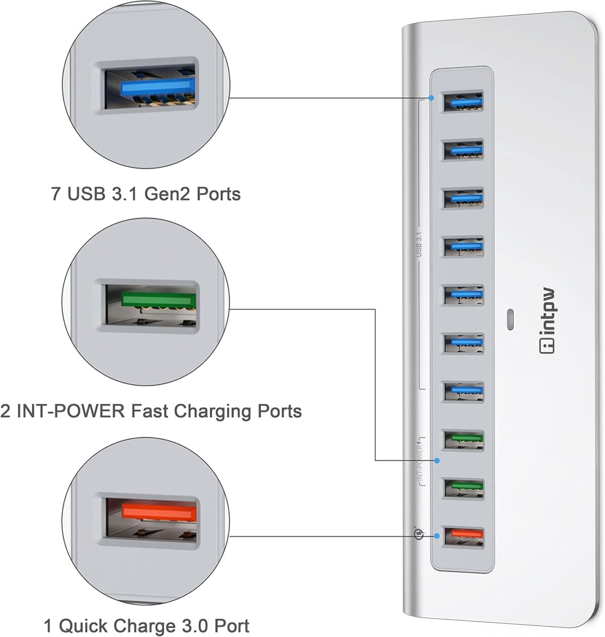 Hybrid USB 3.2 Hub : Intpw USB 3.2 Gen 2 hub equipped with 7 super speed USB 3.1 (USB 3.2 Gen 2) ports allows you expend multiple USB port for laptop and transfer files at speeds up to 10Gbps, twice the data transmission rate of conventional USB 3.0 in theory. With the ultra-high transfer speed, HD photos, videos and any file transfer can be done in seconds.