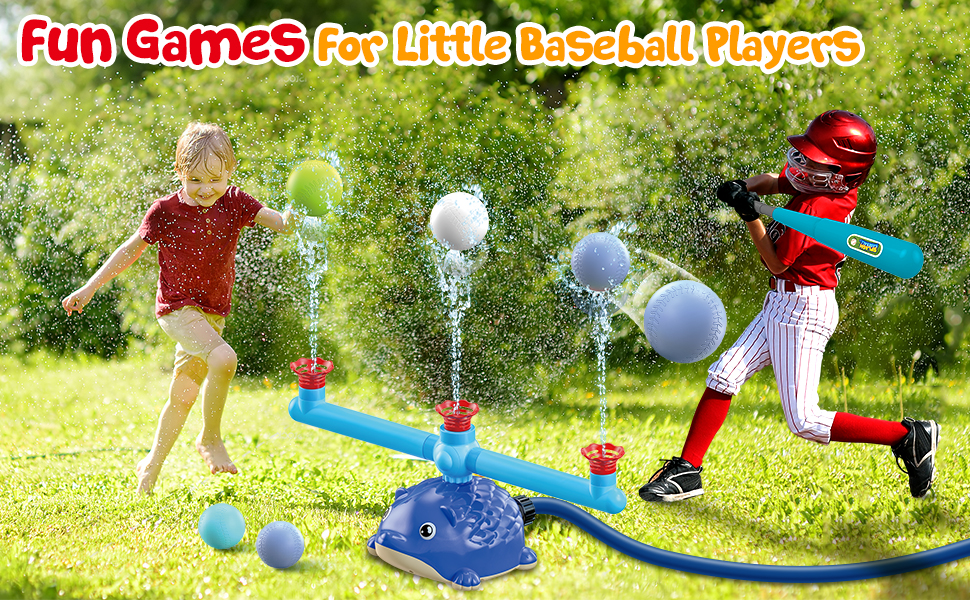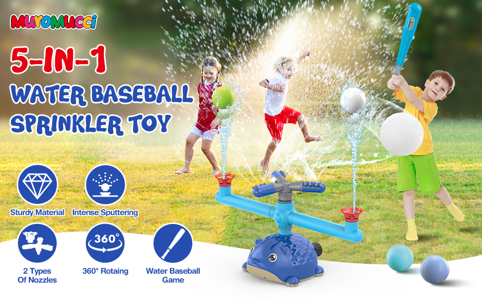 【Five Types of Fun in One Toy】Our 5-in-1 kids sprinklers for yard offers five ways to play. It features an upgraded triple water jet nozzle that can be used in conjunction with the included baseball. Also included is a fountain-style rotating nozzle that sprays a large area. The water jet nozzle and fountain nozzle can be combined or used separately. While you and your child have endless fun, this toy also helps develop their motor skills, batting techniques, and hand-eye coordination.