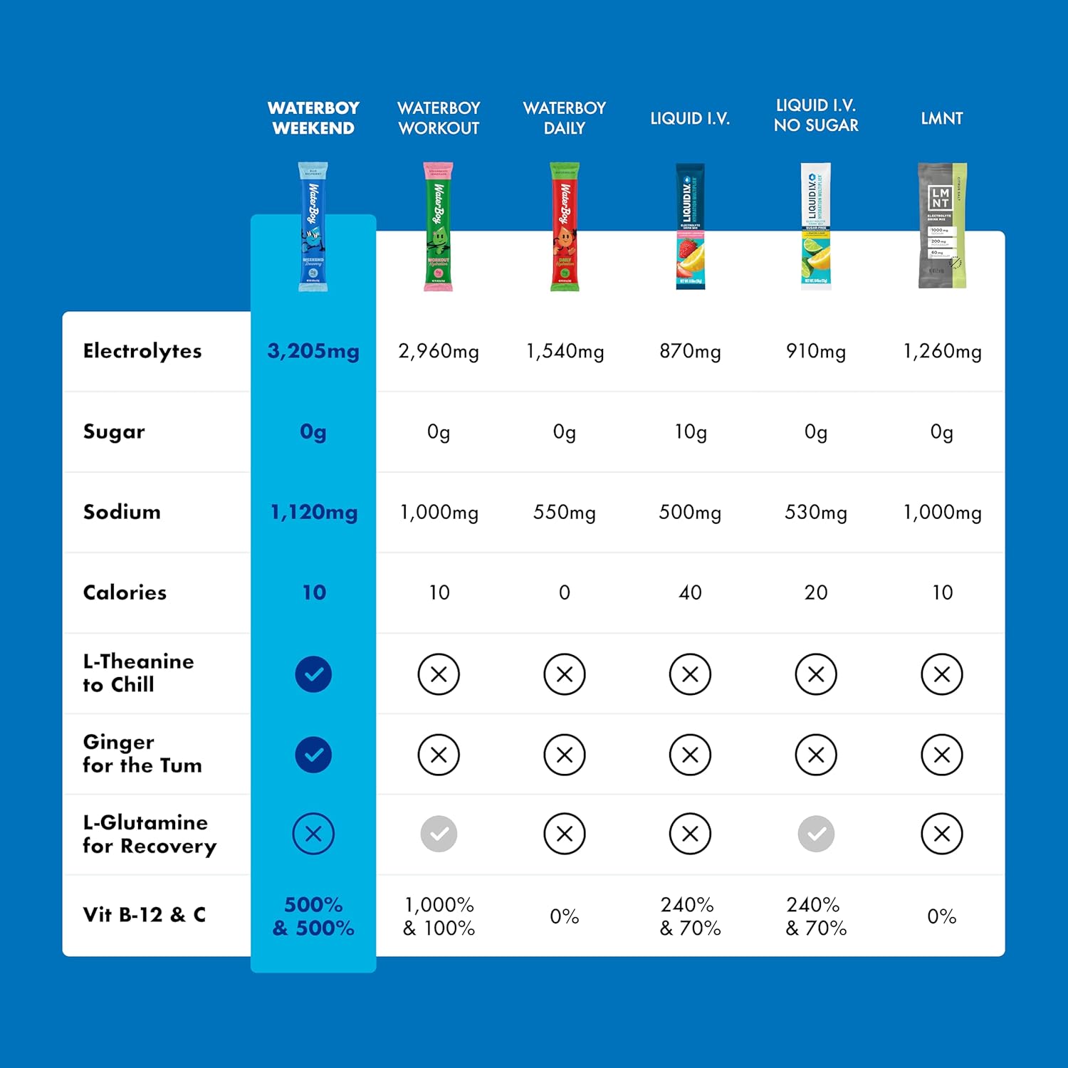 MADE FOR ADULTS: Most electrolyte mixes and electrolyte drinks on the market are made for kids, general hydration or sports or and are LOADED with sugar. Waterboy weekend recovery is made specifically to help adults. Waterboy includes L-theanine, ginger and vitamins to help you bounce back faster